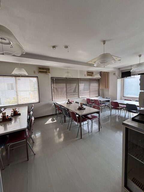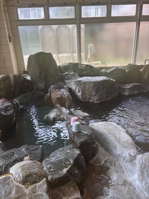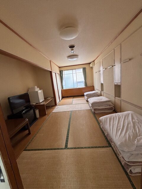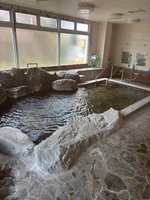 館内は、大きな窓から明るい自然光が差し込む廊下が続いており、採光性の高さが伺えます。客室は畳敷きのゆとりある和室となっており、複数名の利用にも柔軟に対応できる構造です。また、当施設の大きな付加価値となっているのが、広々とした岩風呂風の温浴施設です。一般的なビジネスホテルにはない本格的な大浴場は、利用者の疲労回復に寄与する強力なコンテンツです。さらに、自然光が入り開放感のある食堂スペースも完備され、複数人が一度に食事をとれる環境が整っています。